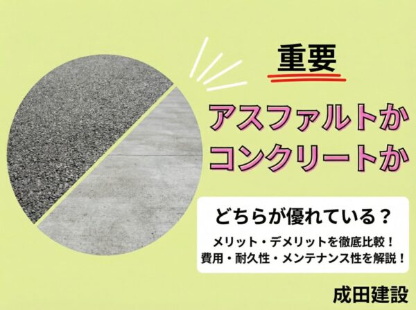 A4. アスファルトは表面が粗いため、雨の日でも比較的滑りにくい特性があります。コンクリートは仕上げ方によりますが、刷毛引き(はけびき)仕上げにすることで、滑り止めの効果を持たせることができます。用途が歩行者中心か車両中心かによって、最適な仕上げ方法を選択すべきです。